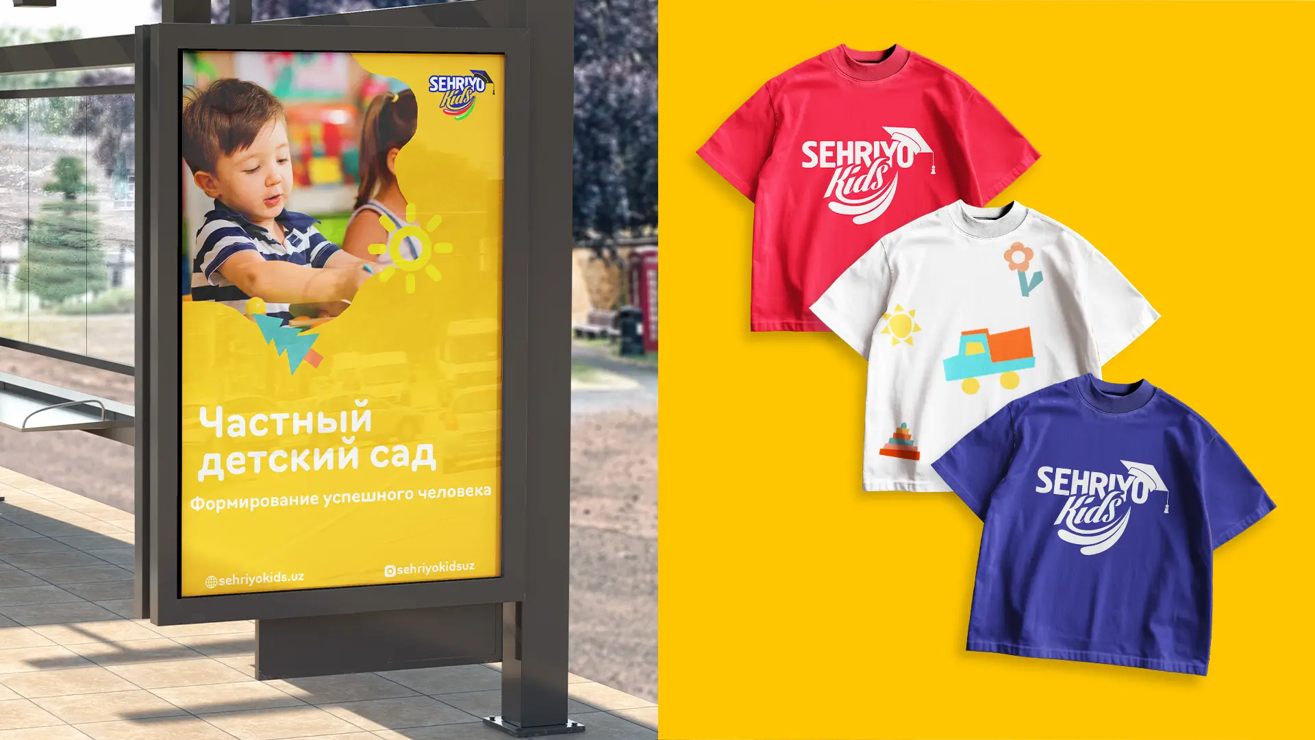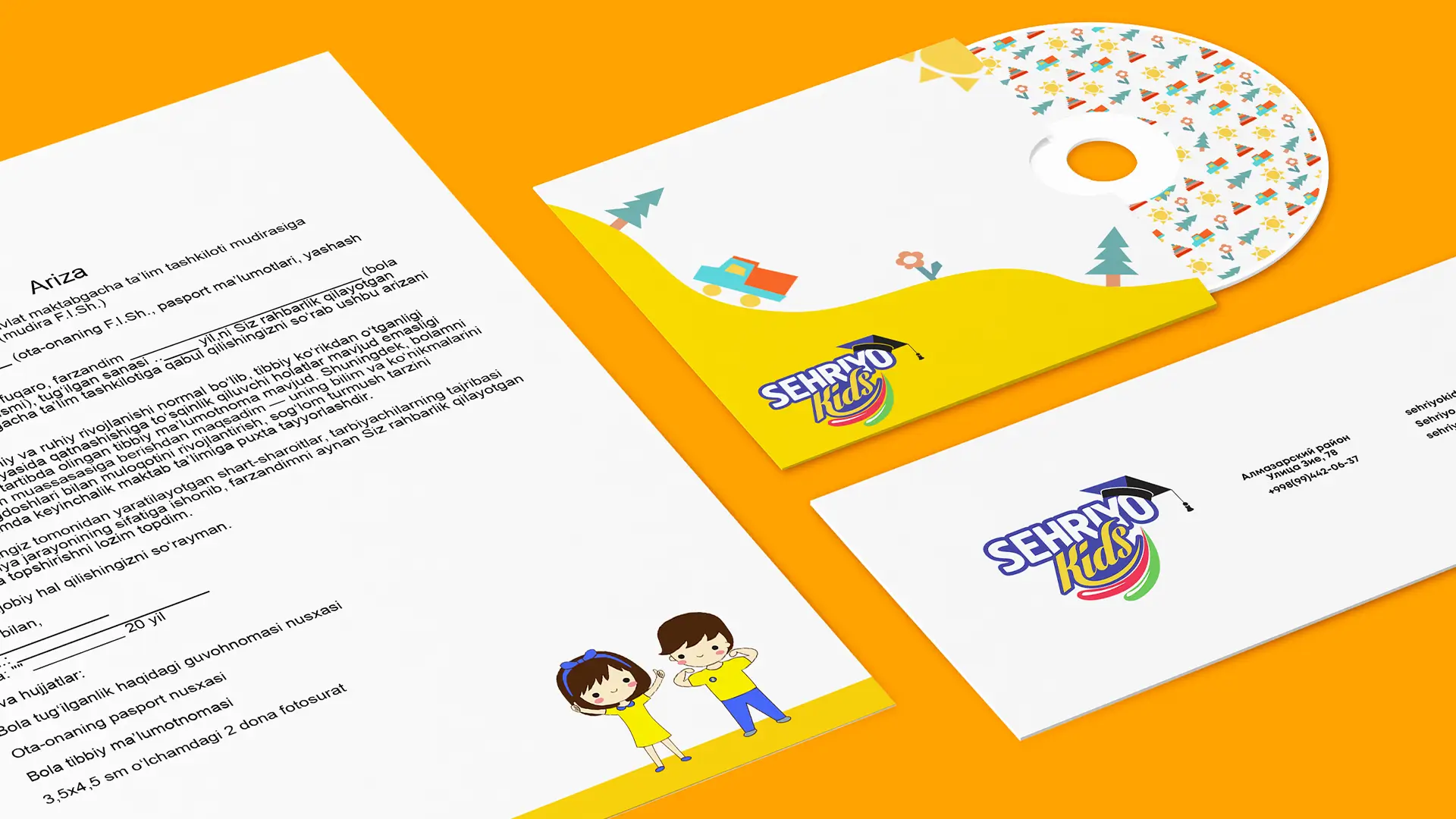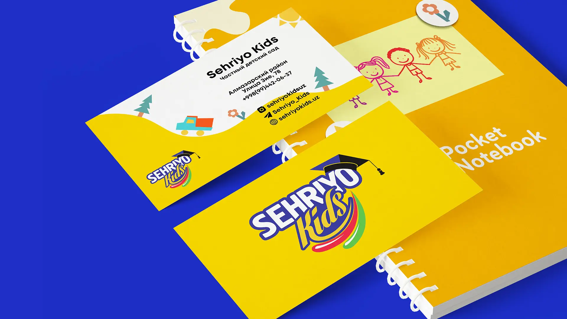 Создать яркий, запоминающийся и дружелюбный фирменный стиль для частного детского сада Sehriyo Kids. Нужно было разработать единый визуальный язык, который будет понятен и детям, и родителям, а также подчеркнёт ценности заведения — творчество, радость и современный подход к обучению.