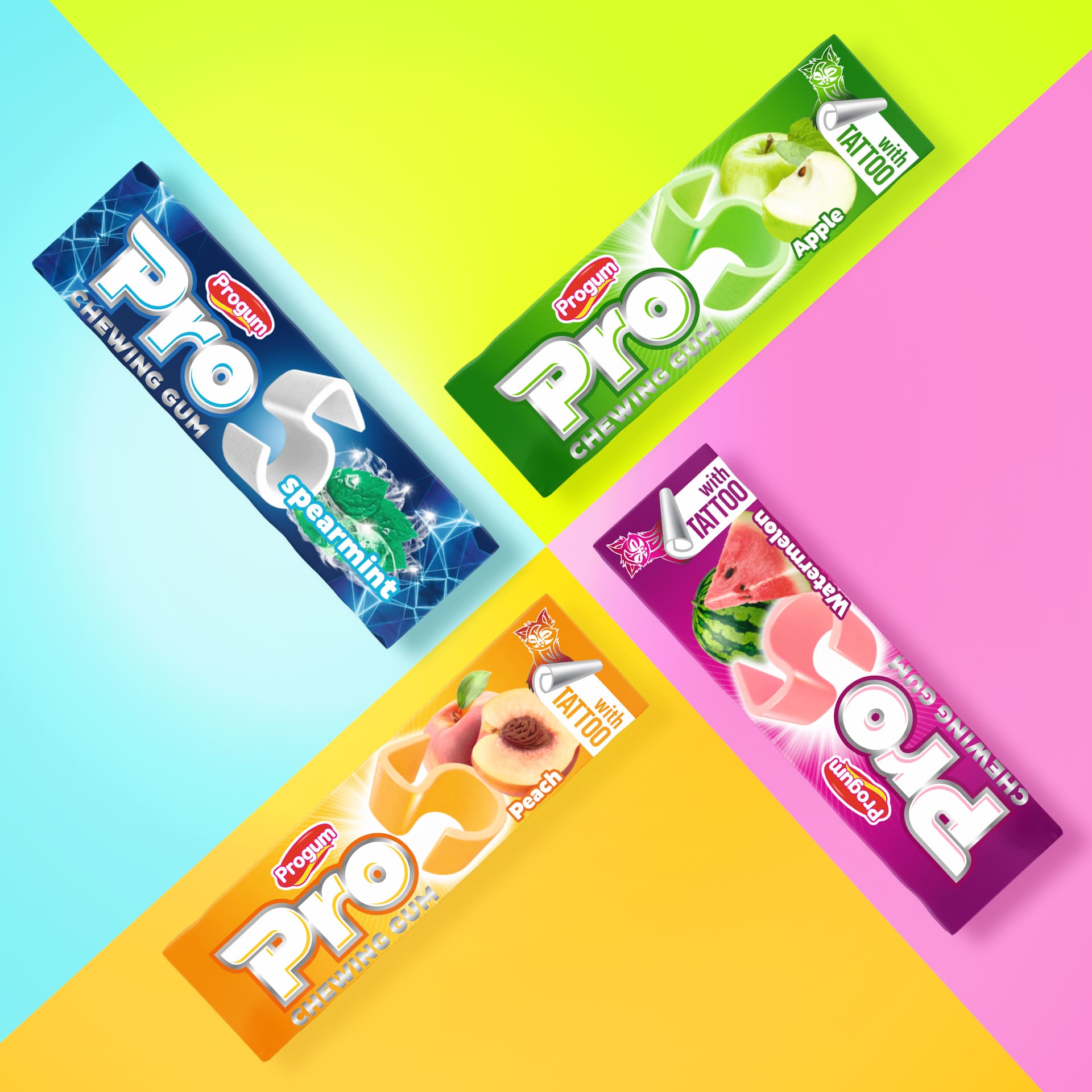 Создать яркую и запоминающуюся упаковку для линейки жевательных резинок Pro Gum, передающую индивидуальность каждого вкуса и сохраняющую единую фирменную стилистику.